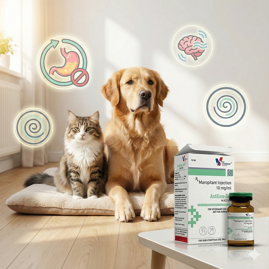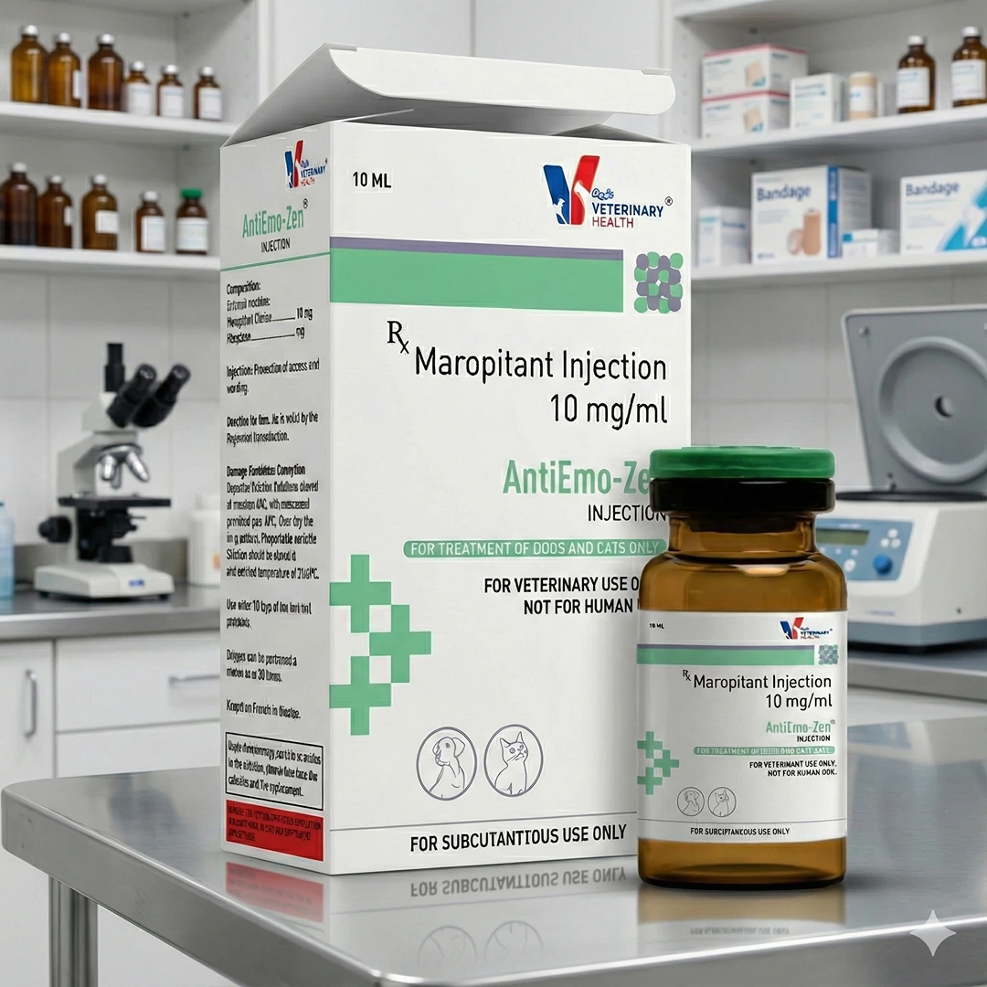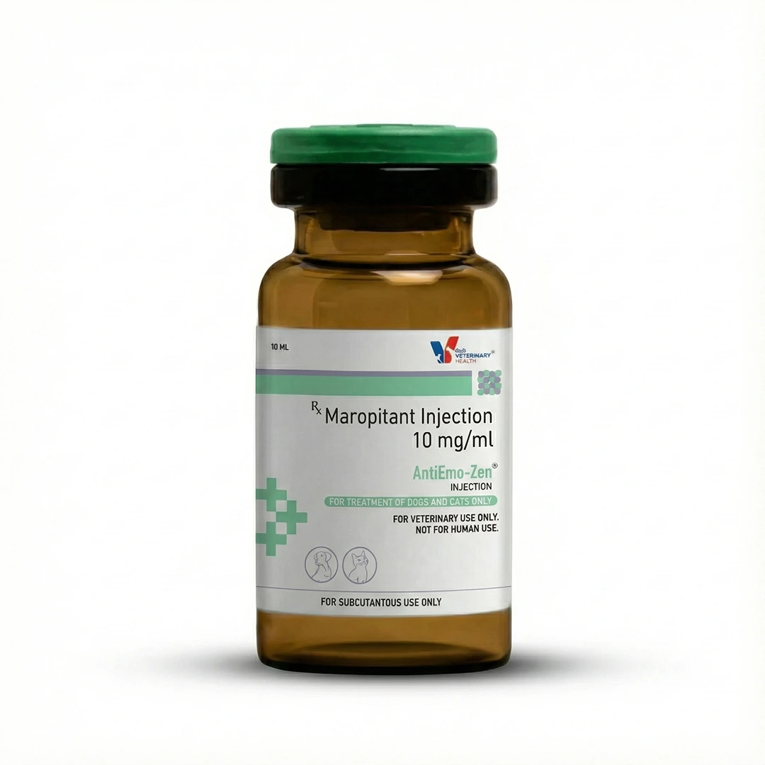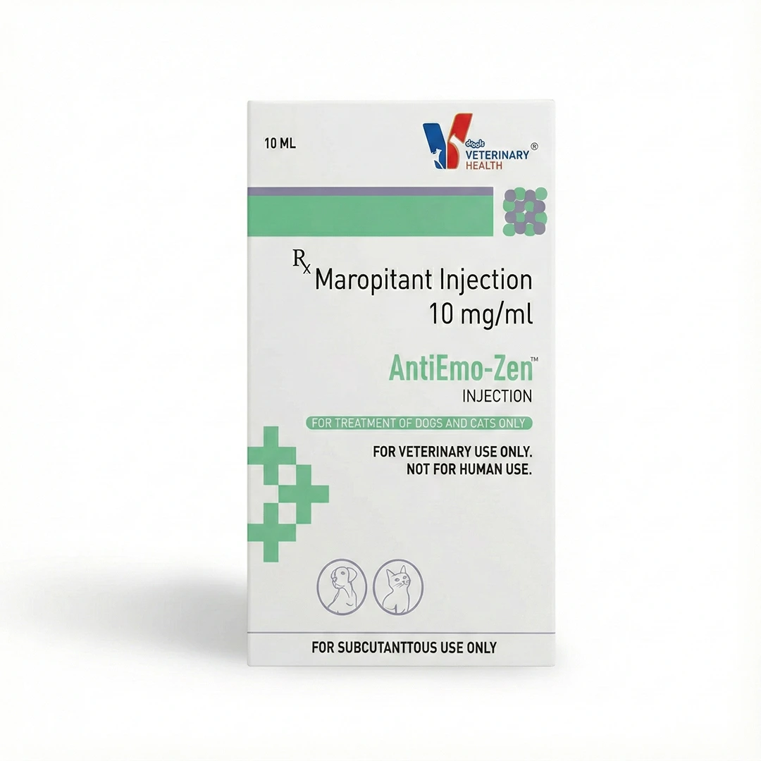 AntiEmo-Zen Injection is a powerful veterinary antiemetic formulation containing Maropitant Citrate 10 mg/ml, designed to control nausea and vomiting in dogs and cats. It works by blocking Neurokinin-1 (NK1) receptors in the central nervous system, thereby preventing emesis caused by multiple underlying conditions.