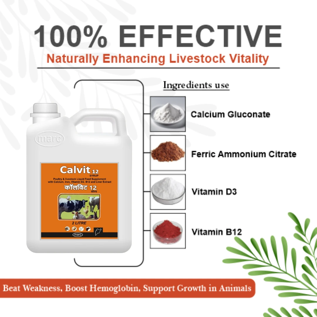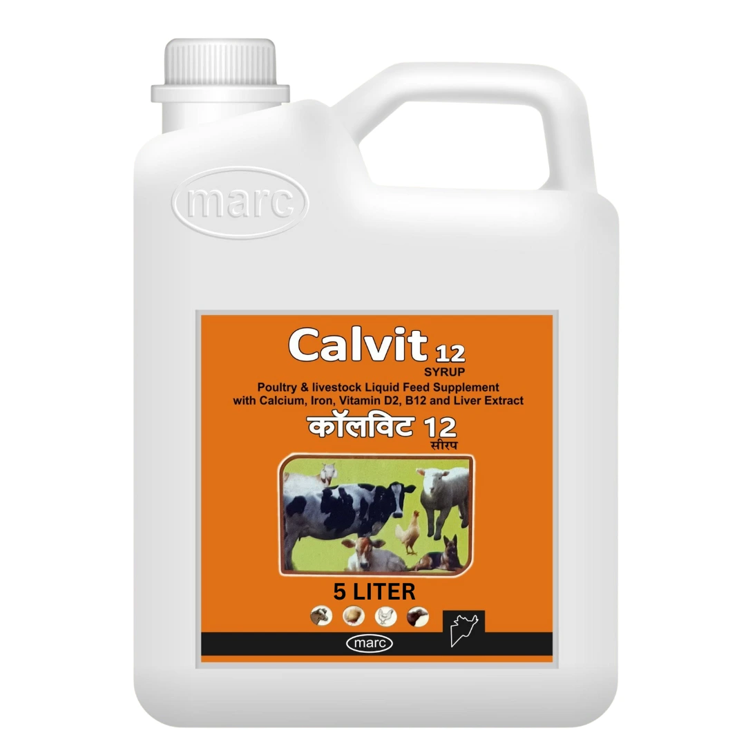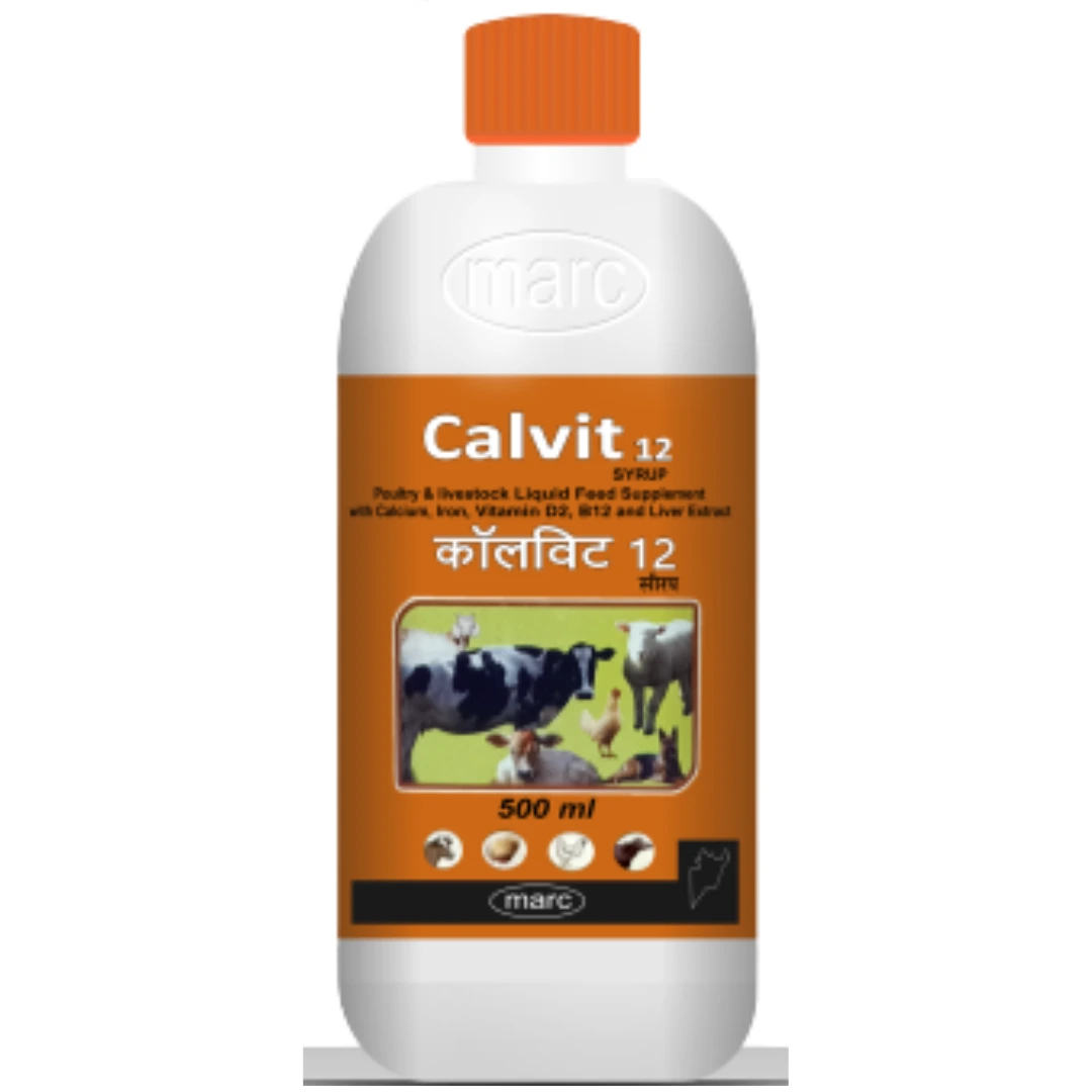 Calvit 12 Syrup is a scientifically formulated veterinary supplement enriched with Calcium Gluconate, Cholecalciferol (Vitamin D3), Proteolysed Liver Extract, Ferric Ammonium Citrate, and Vitamin B12. This power-packed blend supports optimal bone health, growth, milk and egg production, and anemia prevention in livestock, poultry, and companion animals.